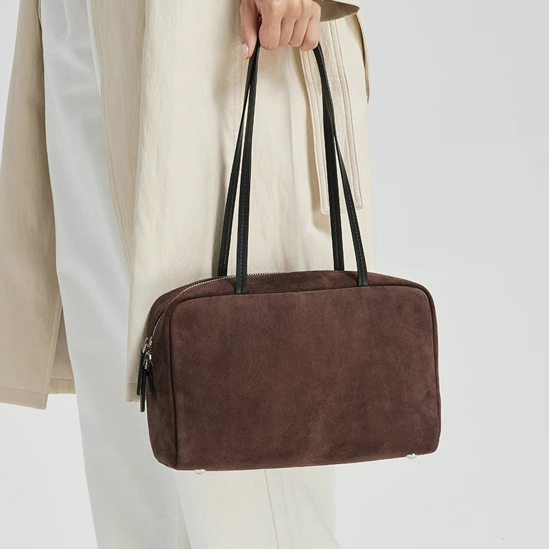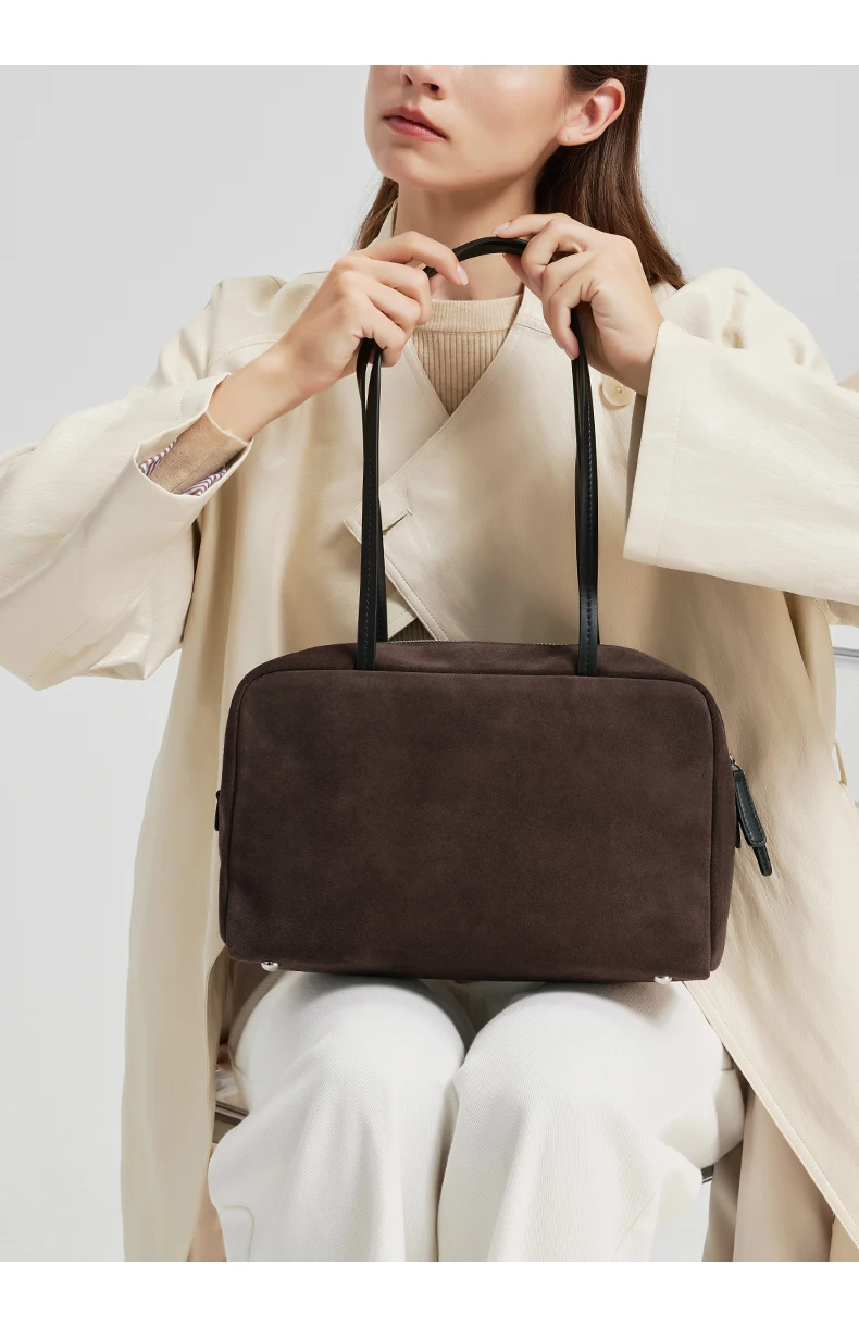 Le "Boston Douceur d'Hiver" est la pièce maîtresse de la saison 2025, réinterprétant le sac bowling classique avec la texture chaleureuse du daim. Il incarne parfaitement l'esthétique Luxe Coréen avec un équilibre idéal entre structure vintage et confort moderne.